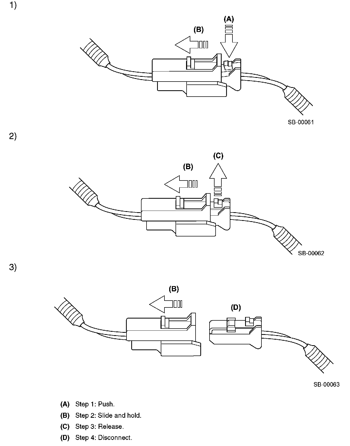 Insert the male side connector half into the other until a "click" is heard, then push in the green lever (B) until a "click" is heard.This engages the double lock mechanism.