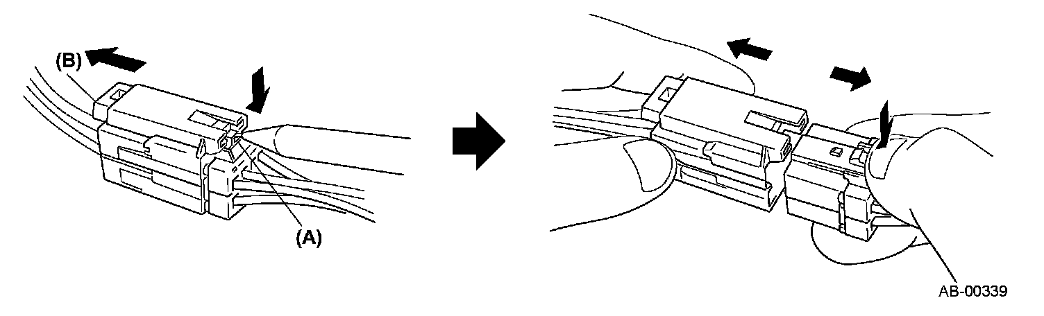 Press the lever (A) to let the green lever (B) pop out.This unlocks the double lock mechanism.Then separate the connector halves by pulling them apart while pressing the lever (A).