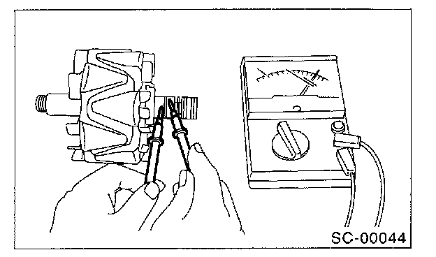 Check the continuity between slip ring and rotor core or shaft. If resistance is 1 Ohm or less, the rotor coil is grounded, and so replace the rotor assembly.
