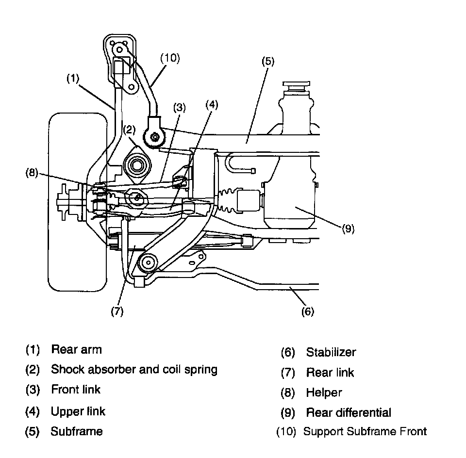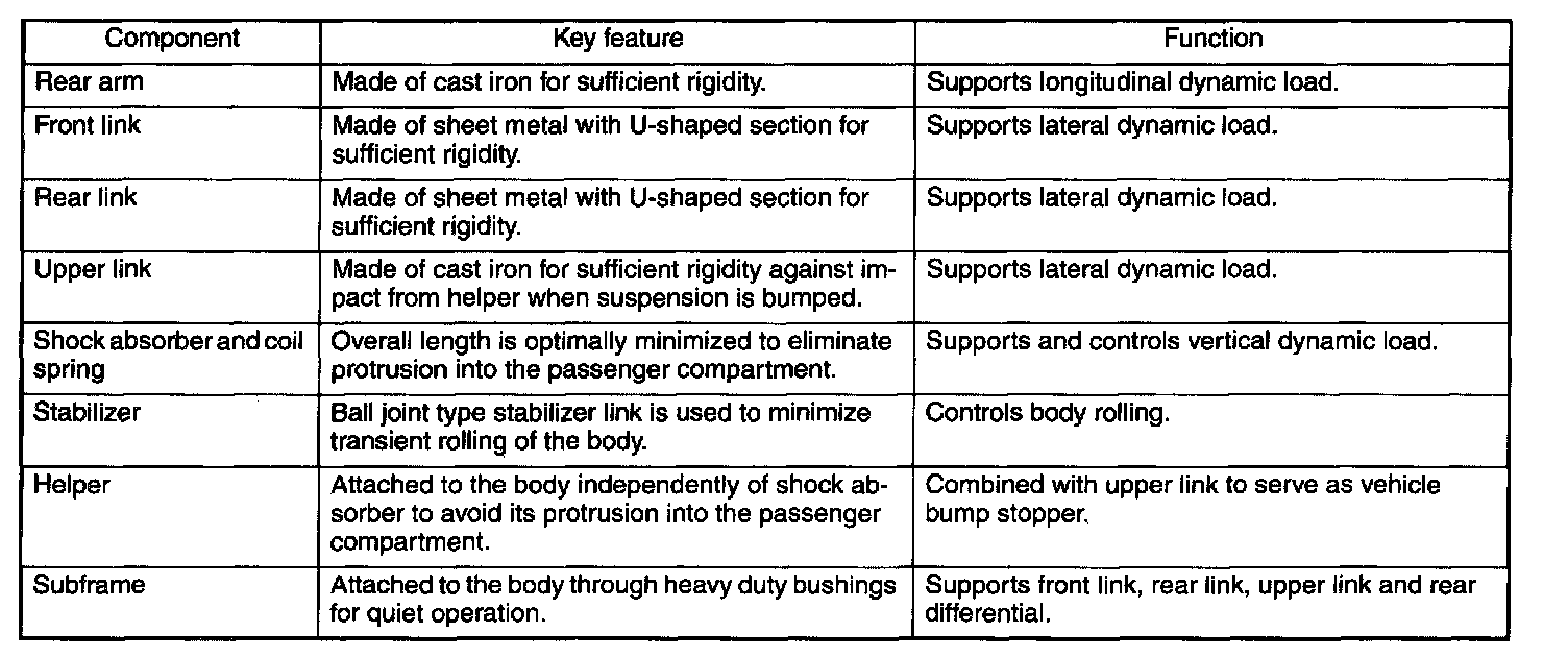 This suspension also features quiet operation because the front link, rear link, upper link and rear differential are all attached to a subframe which in turn is installed to the vehicle body through heavy-duty bushings.
