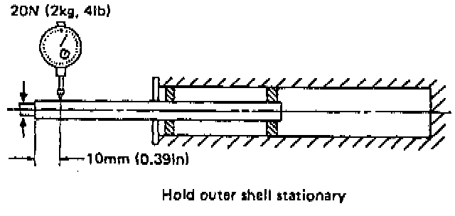 Fix outer shell and fully extend the rod. Set a dial gauge at the end of the rod: L [10 mm (0.39 inch)], then apply a force of W [20 N (2 kgf, 4 lb)] to threaded portion. With the force of 20 N (2 kgf, 4 lb) applied, read dial gauge indication: P.. Apply a force of 20 N (2 kgf, 4 lb) in the opposite direction of "W", then read dial gauge indication: P2.
