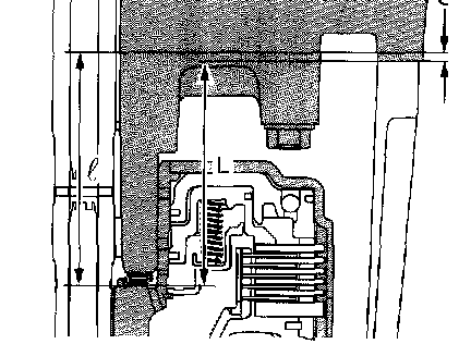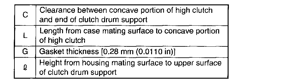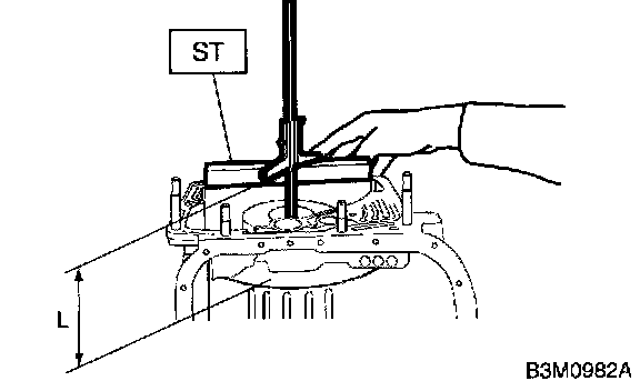 1. Using ST, measure the distance from the transmission case mating surface to the recessed portion of the high clutch drum "L".