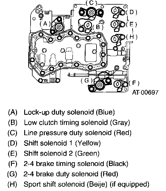 11. Install the sensor, solenoids and duty solenoids to specified positions.
