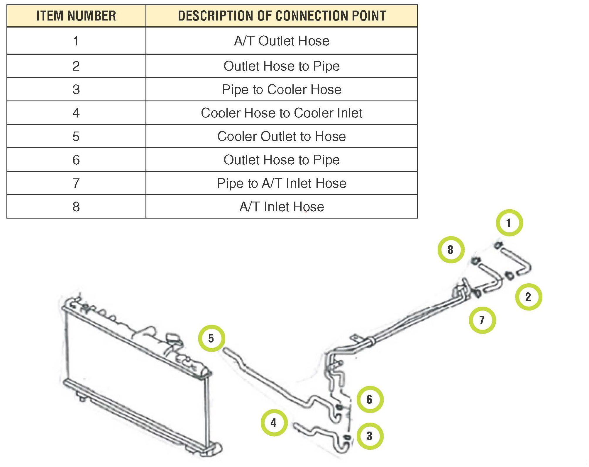 This bulletin will provide an inspection procedure for the A/T fluid cooler hoses and piping connection points between the radiator and the transmission assembly.