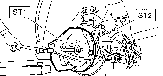 6. Remove axle nut and drive shaft. If it is hard to remove, use ST1 and ST2.
