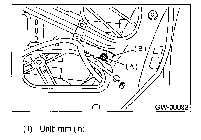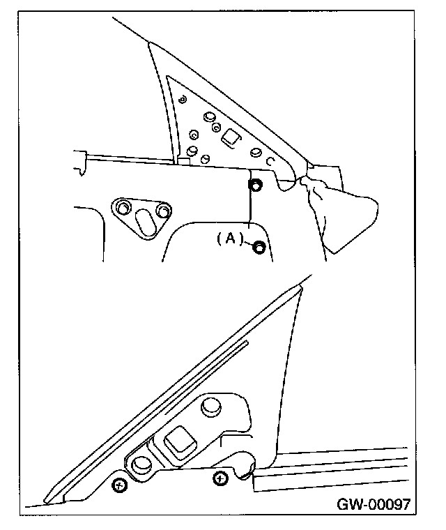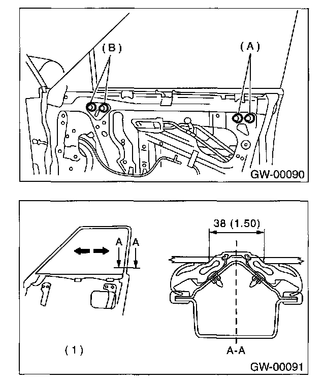 12. After adjustment of glass, if there is a gap between outer lip of gusset and glass surface, adjust the gap with adjusting bolt (A) in lower fitting part of gusset to prevent generation of wind noise.