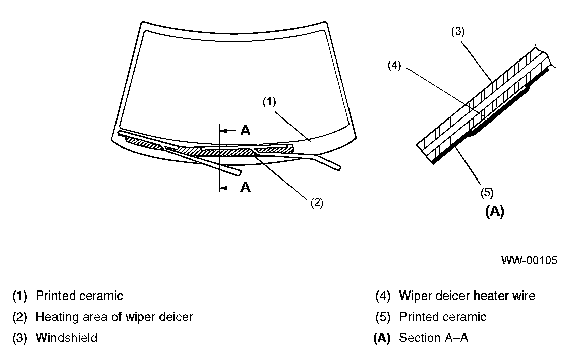The wiper deicer system is activated when the wiper deicer switch is pressed with the ignition switch turned ON. It heats the lower part of the windshield with a heater wire to melt the ice that blocks the wiper blades.