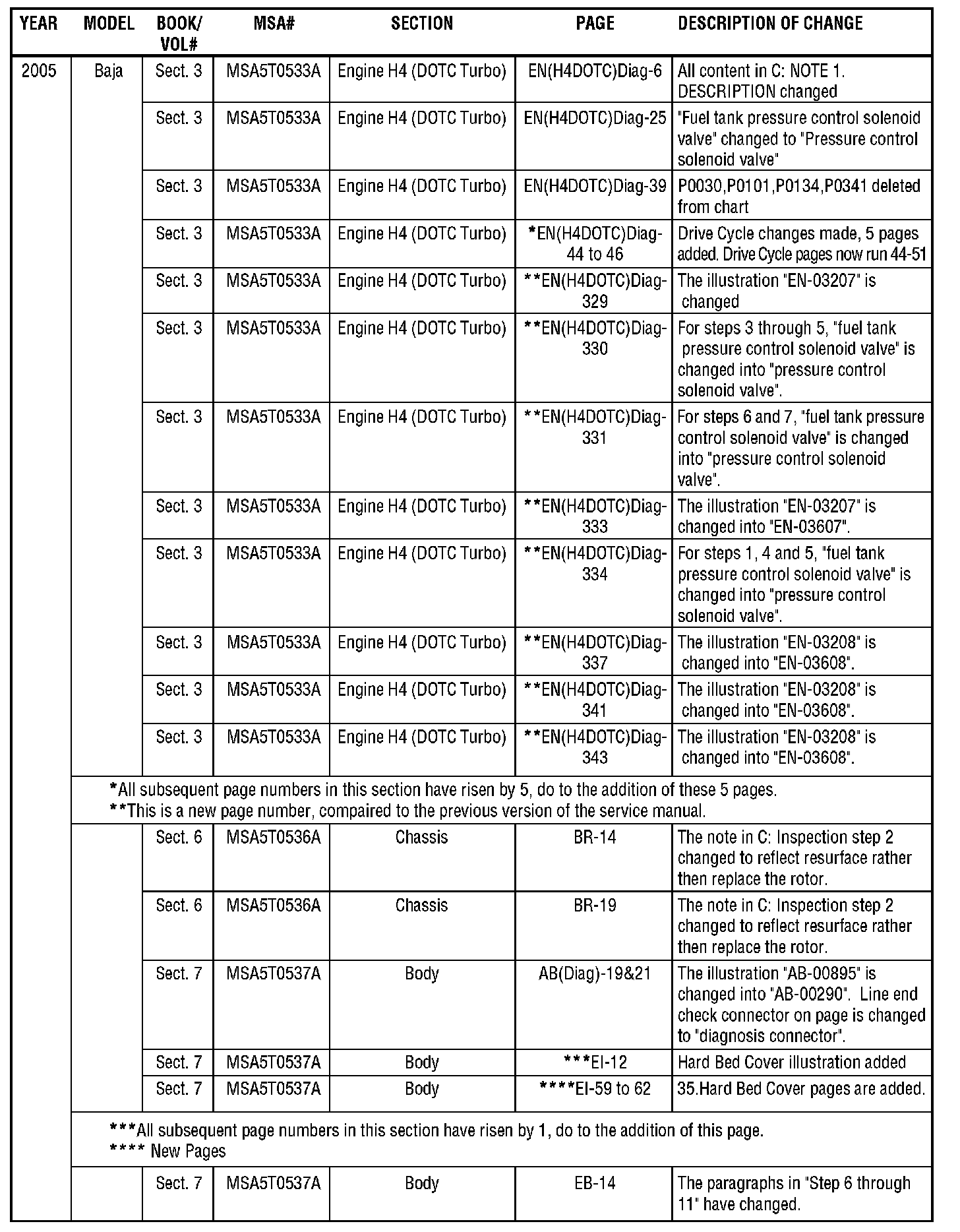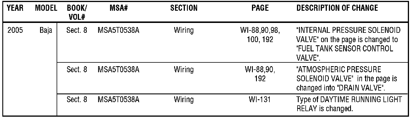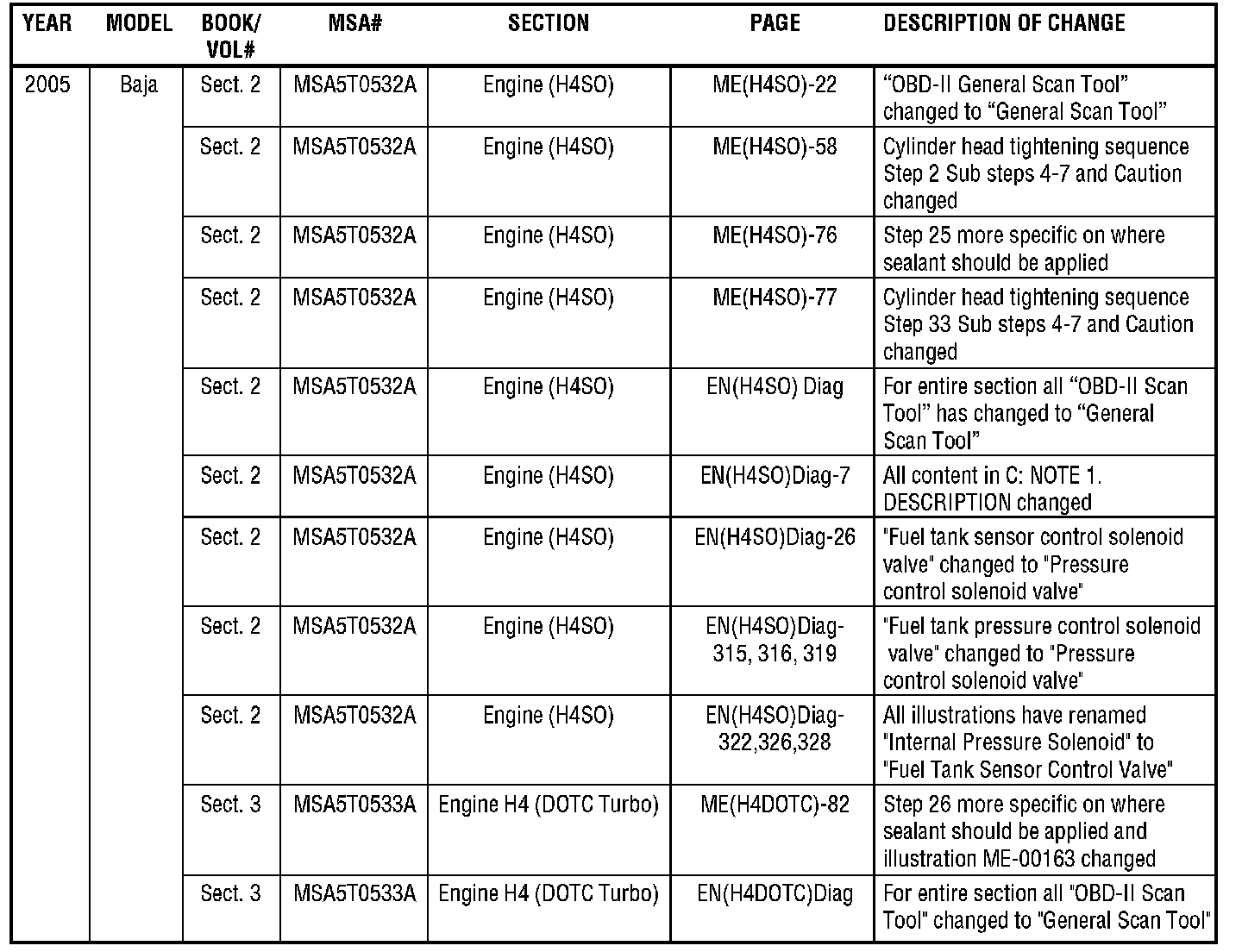 The purpose of this bulletin is to provide a description of current changes to Service Manuals available via the Subaru Technical Information System (STIS) web site. The tables shown are to be used as guides for becoming aware of the latest changes, and can be used to update printed copies in conjunction with the PDFs available on the STIS web site. Printed pages will not be made available to update printed Service Manuals.