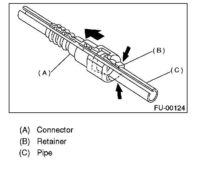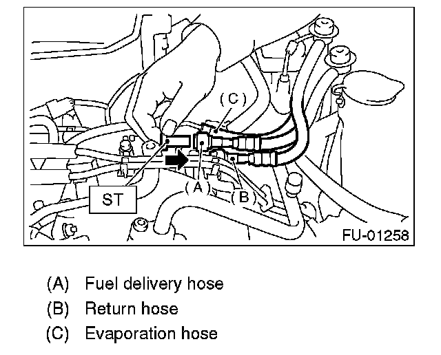 1. Separate quick connector of fuel delivery line and return line by pushing an ST in the direction of the arrow.