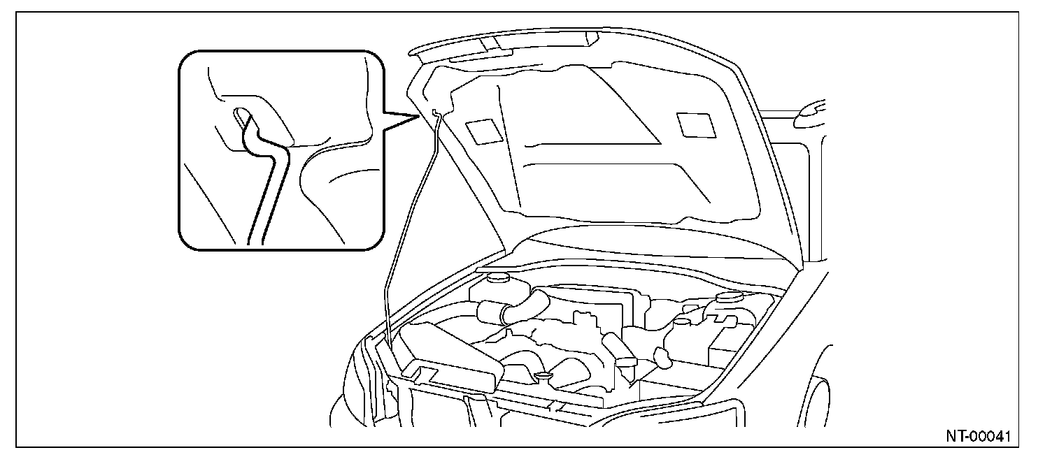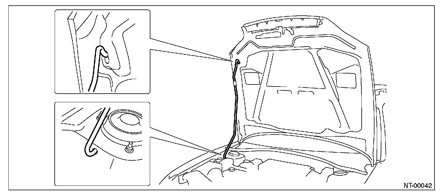 NOTE: Before setting the hood in this position, remove the windshield washer hose attaching clip from the hood.