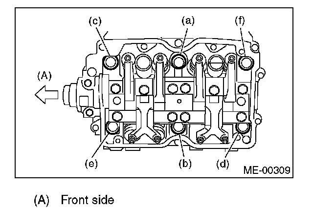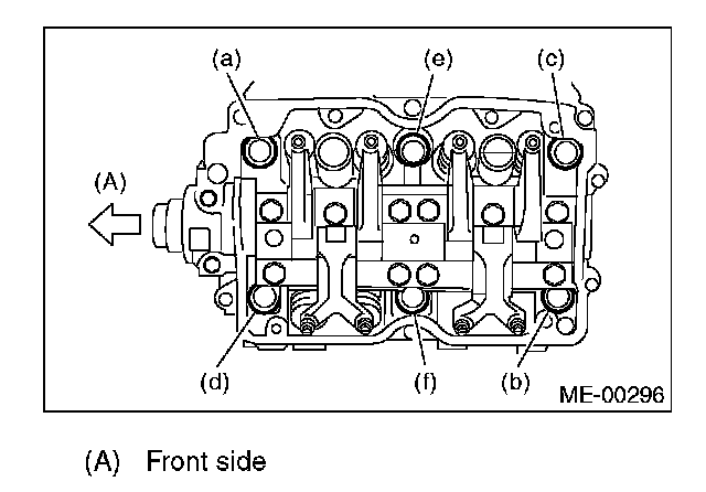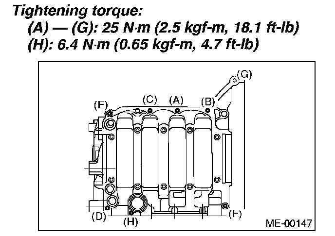 b) Tighten all bolts to 29 Nm (3.0 kgf-m, 22 ft. lbs.) in alphabetical sequence. Then tighten all bolts to 69 Nm (7.0 kgf-m, 51 ft. lbs.) in alphabetical sequence.
