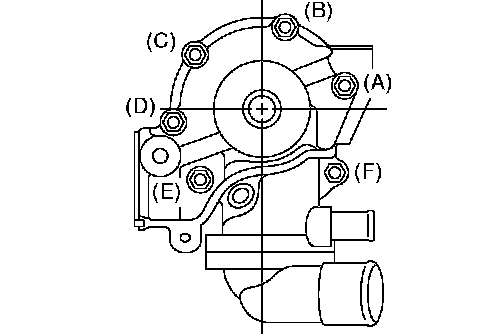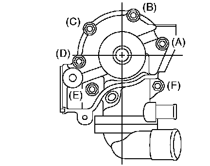 ^ When installing the water pump, tighten bolts in two stages in alphabetical sequence as shown in the figure.