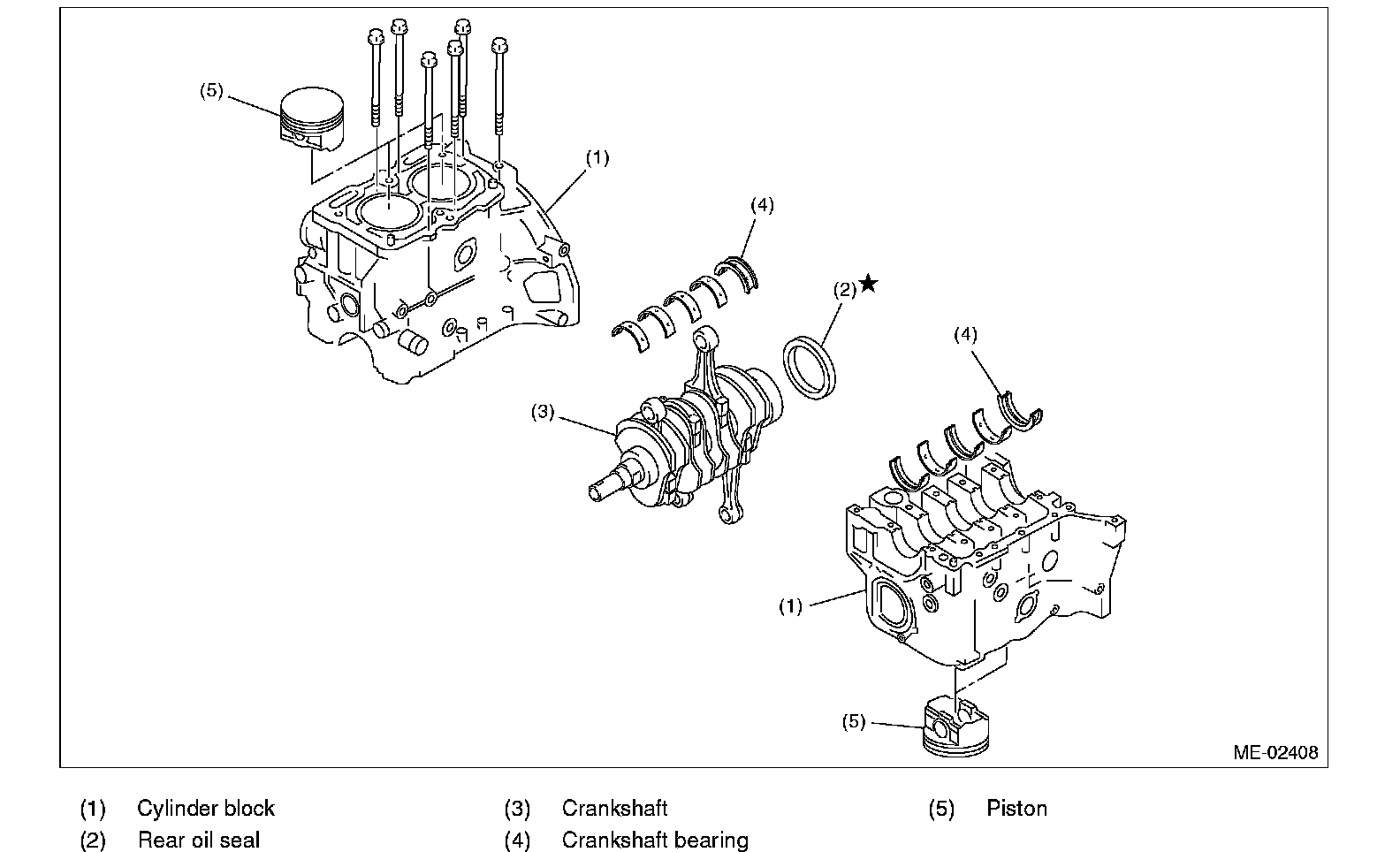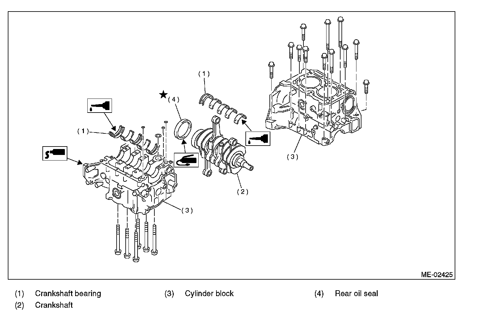 NOTE: Remove oil on the mating surface of bearing and cylinder block before installation. Apply a coat of engine oil to crankshaft pins.