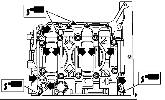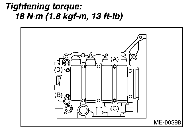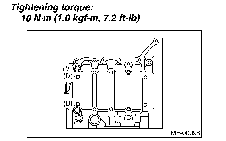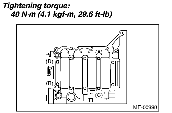 4) Tighten the 10 mm cylinder block connecting bolts on LH side (A-D) in alphabetical sequence.