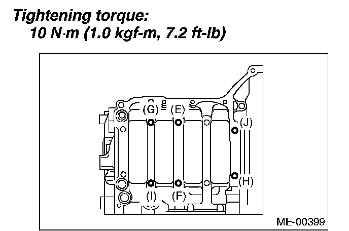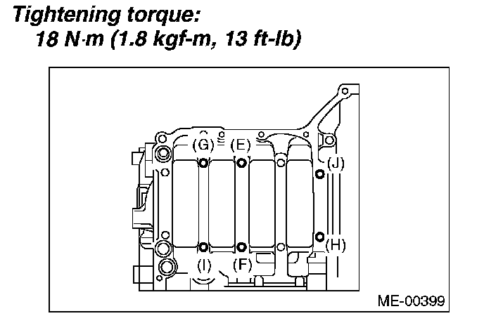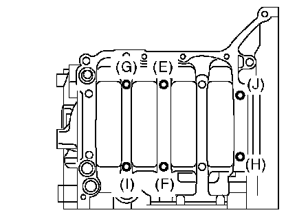 5) Tighten the 10 mm cylinder block connecting bolts on RH side (E-J) in alphabetical sequence.