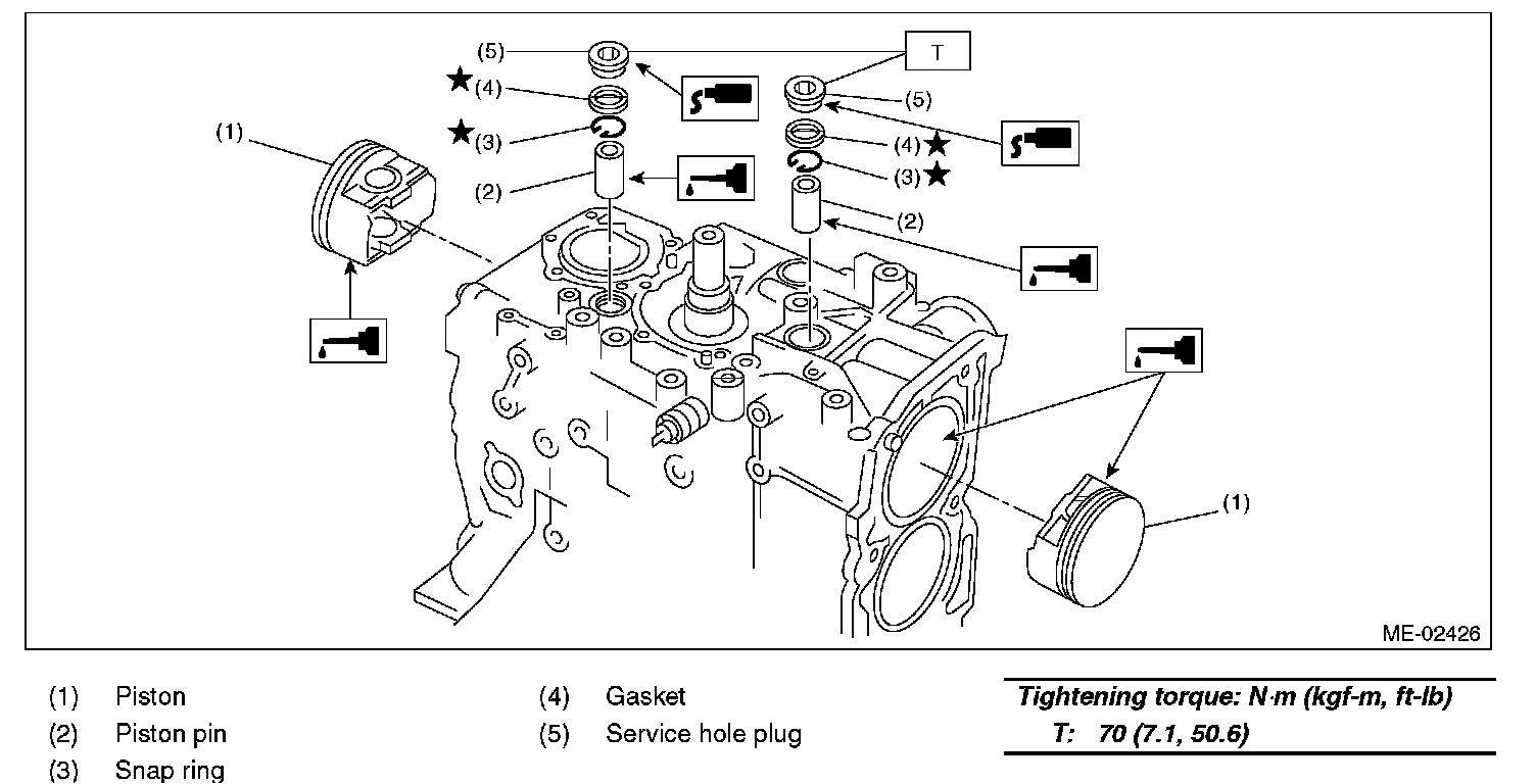 c) Apply a coat of engine oil to piston pin, and insert the piston pin into piston and connecting rod through service hole.