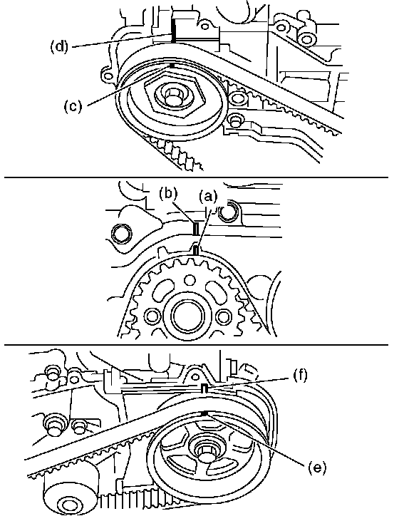 (1) To turn crankshaft, use the ST: Align the mark (a) of sprocket to the cylinder block notch (b), and then ensure the right side cam sprocket mark (c), cam cap and cylinder head matching surface (d) or left side cam sprocket mark (e), timing belt cover notch (f) are properly adjusted.
