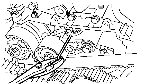 4) After ensuring the marks on timing belt and cam sprockets are aligned, remove the stopper pin from belt tension adjuster.