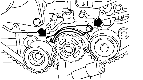 When installing the timing belt, be sure to align all alignment marks on the belt with corresponding marks on the sprockets. If incorrectly installed, interference between pistons and valves may occur.