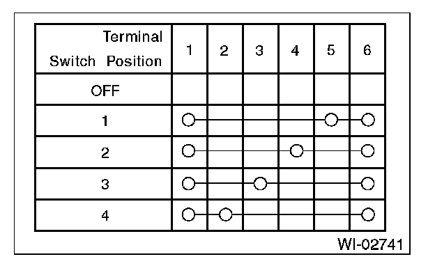 3. Symbol "O--O" indicates that continuity exists between two points or terminals. For example, when a switch position is "3", continuity exists among terminals 1, 3 and 6, as shown in table.