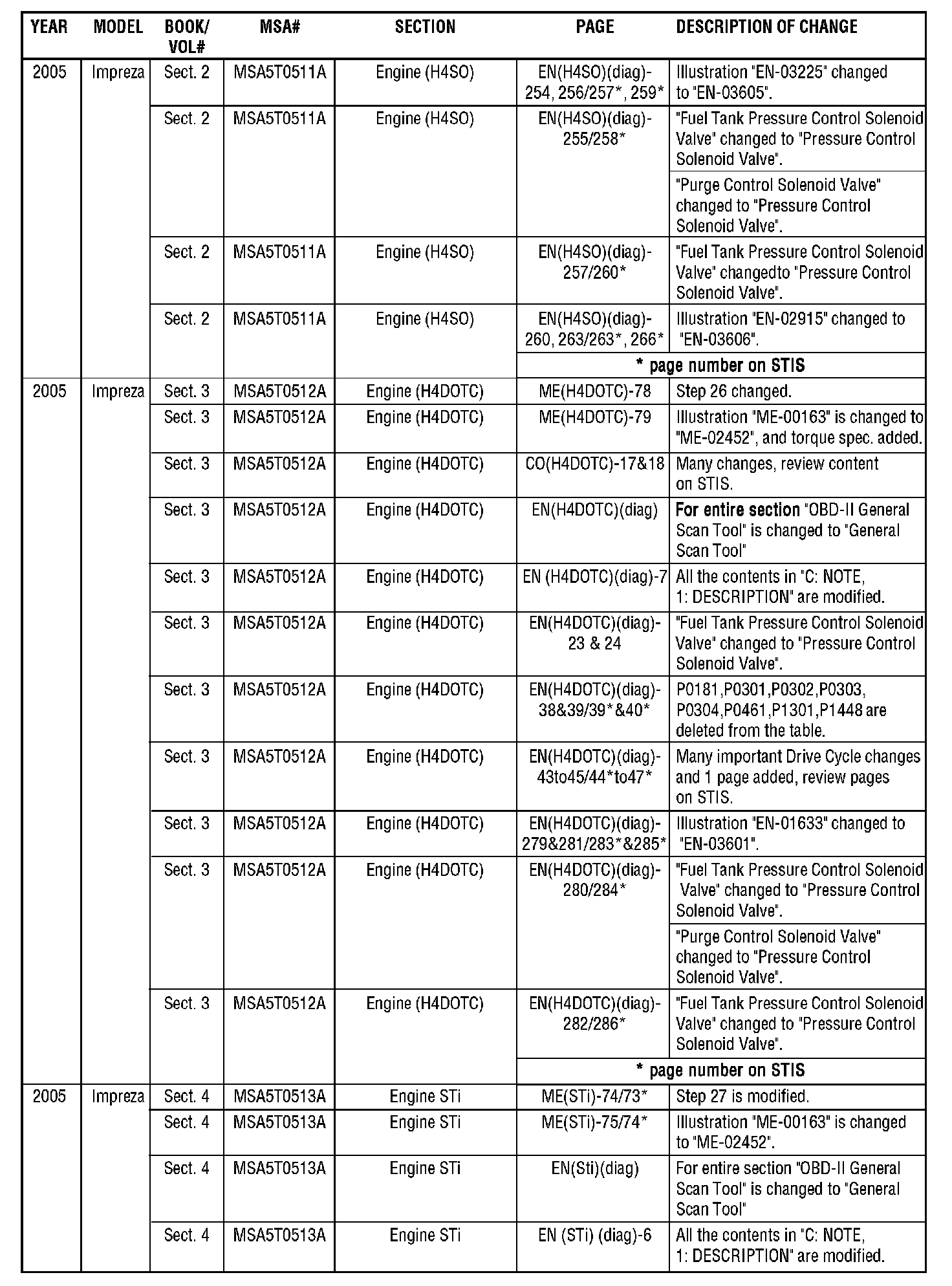 The purpose of this bulletin is to provide a description of current changes to Service Manuals available via the Subaru Technical Information System (STIS) website. The tables contained within this bulletin are to be used as guides for becoming aware of the latest changes, and can be used to update printed copies in conjunction with the PDFs available on the STIS website. Printed pages will not be made available to update printed Service Manuals.