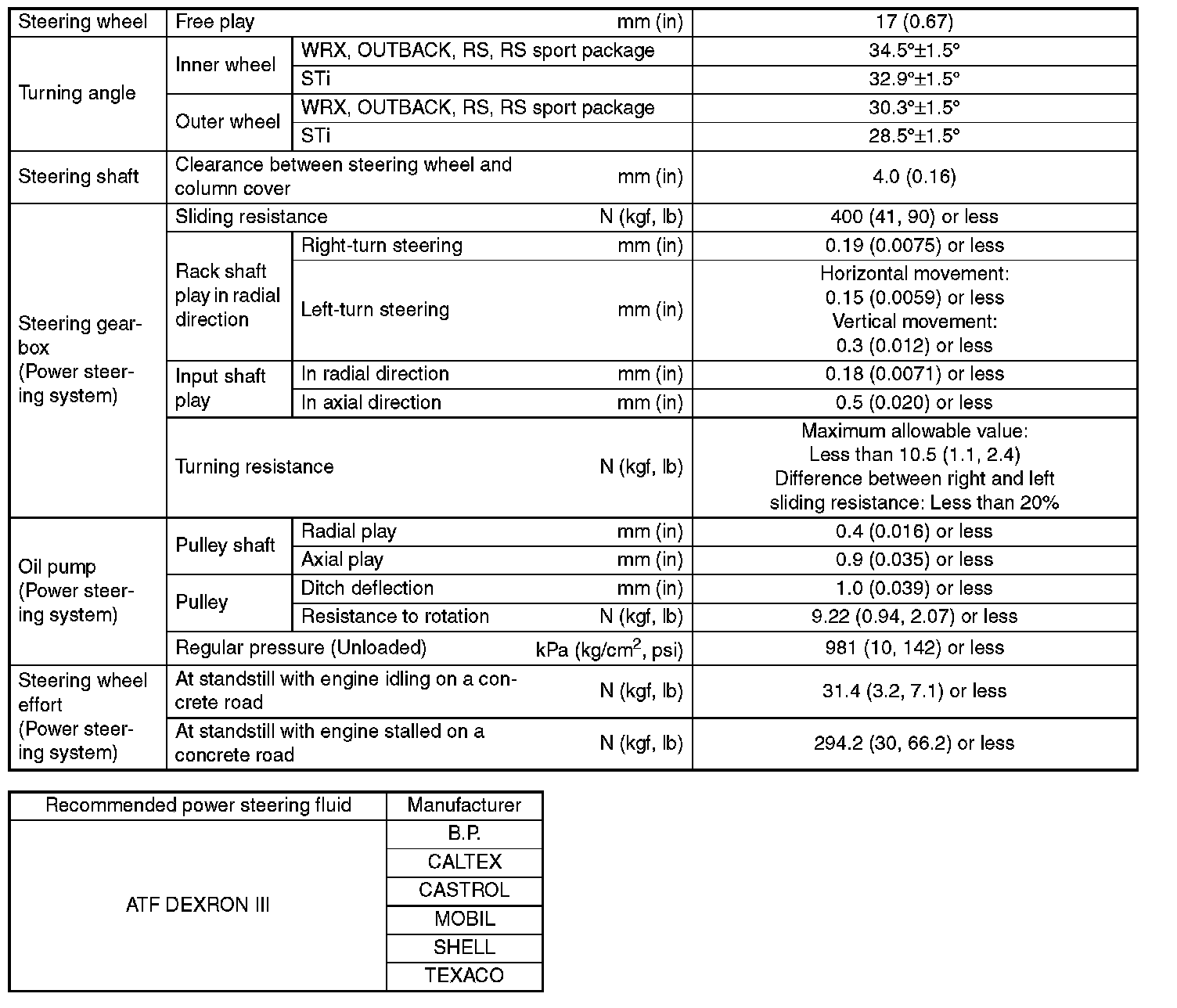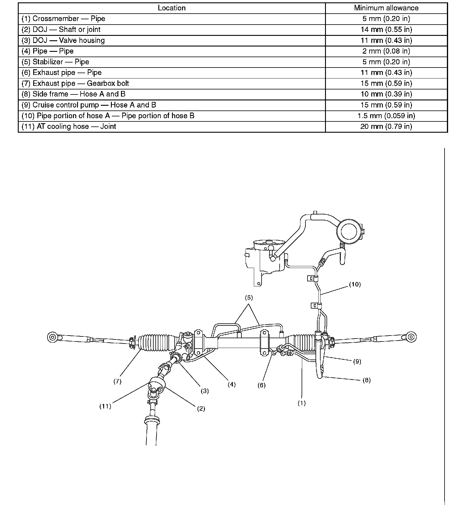 This table lists various clearances that must be correctly adjusted to ensure the normal vehicle driving without interfering noise, or any other faults.