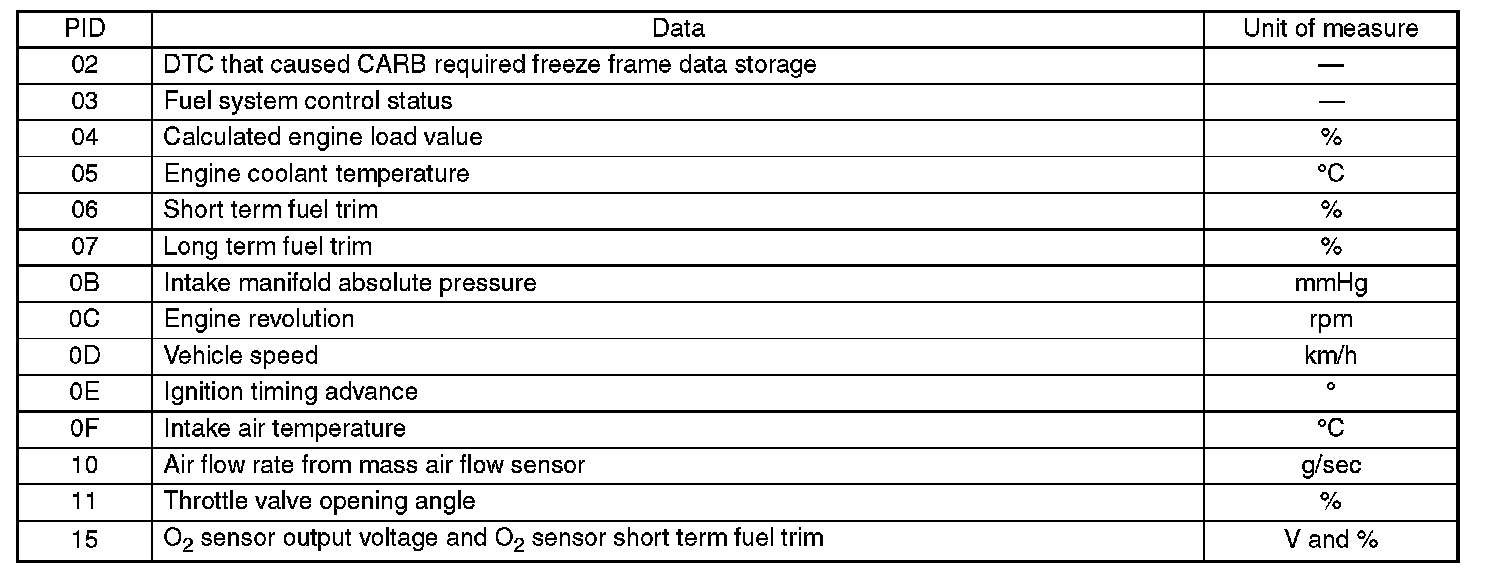 Refers to data denoting the operating condition when trouble is sensed by the on-board diagnosis system. A list of the support data and PID (Parameter Identification) codes are shown in the table.