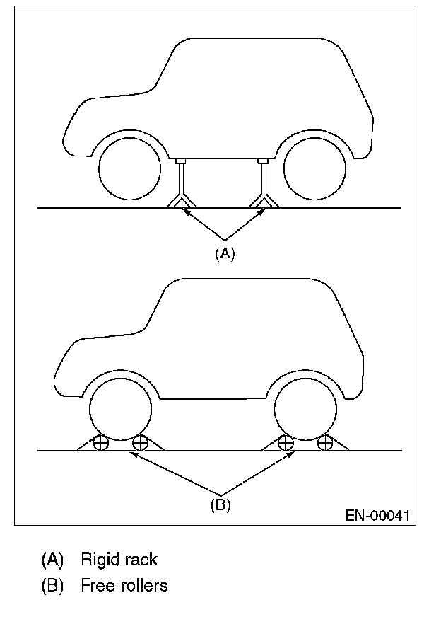 2. Raise the vehicle using a garage jack and place on rigid racks or drive the vehicle onto free rollers.