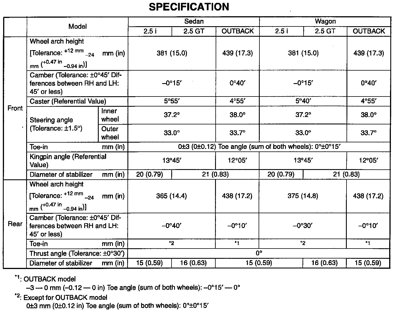 ^ Other items indicated in the specification table cannot be adjusted. If those items exceed specifications, check suspension parts and connections for deformities; replace with new ones as required.