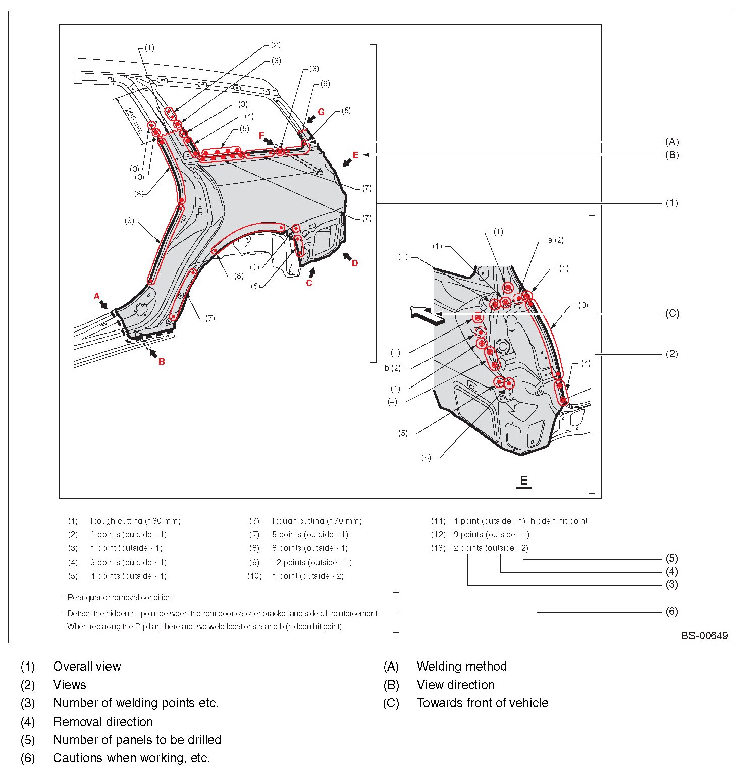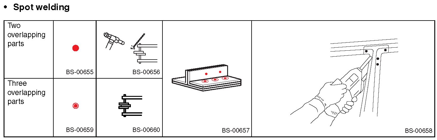 - Symbols and number of points indicate the welding method and the number of welding points. Text in brackets indicate the direction of removal for welded parts, and numbers indicate the number of panels to be drilled to remove welded sections of panels.