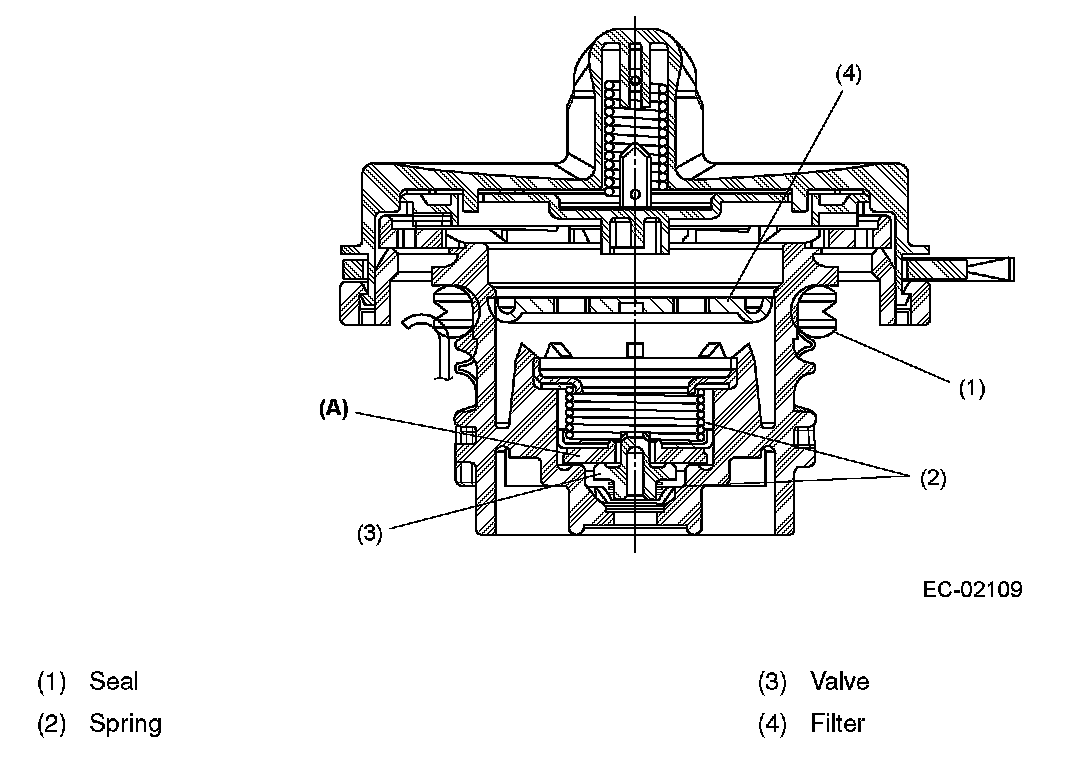 - When there is no problem with the fuel vapor line, the filler pipe is sealed at the portion (A) and by the seal pressed against the filler pipe end. If vacuum develops in the fuel tank, the atmospheric pressure forces the spring down to open the valve; consequently outside air flows into the fuel tank, thus controlling the inside pressure.