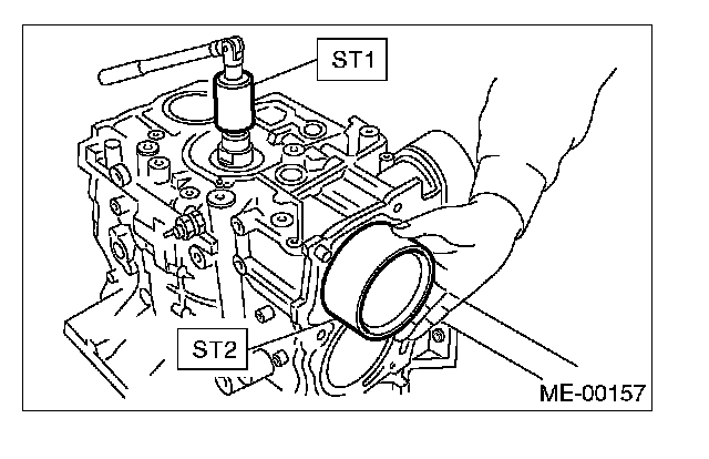 2 Press the bushing with ST after applying oil on the periphery of bushing.