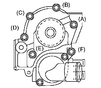 ^ When installing the water pump, tighten the bolts in two stages in alphabetical sequence as shown in the figure.