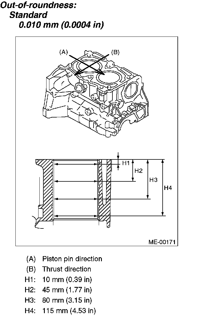 1 If one of the values of taper, out-of-roundness, or cylinder-to-piston clearance exceeds the specified limit or is out of standard, or if there is any damage on the cylinder wall, rebore it to use an oversize piston.