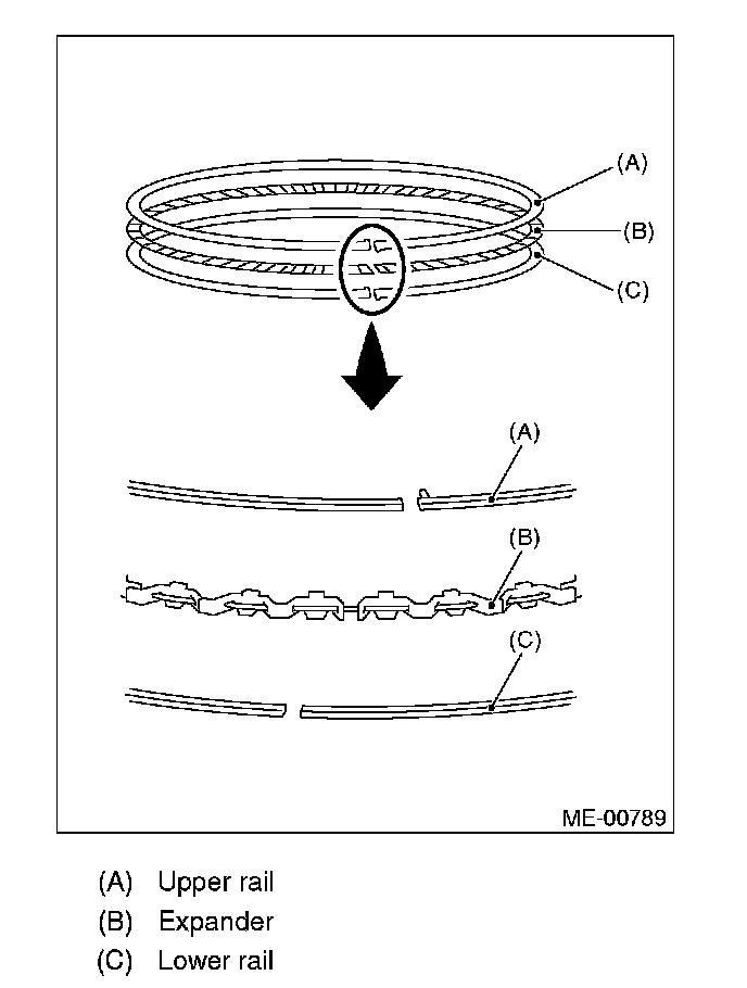 ^ Oil ring consists of the upper rail, expander and lower rail. When installing on piston, be careful of each rail's direction.