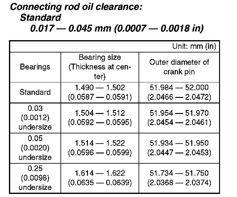 5. Measure the oil clearance on individual connecting rod bearings by means of plastigauge. If any oil clearance is not within the specification, replace the defective bearing with a new one of standard size or undersize as necessary. (See the table below.)