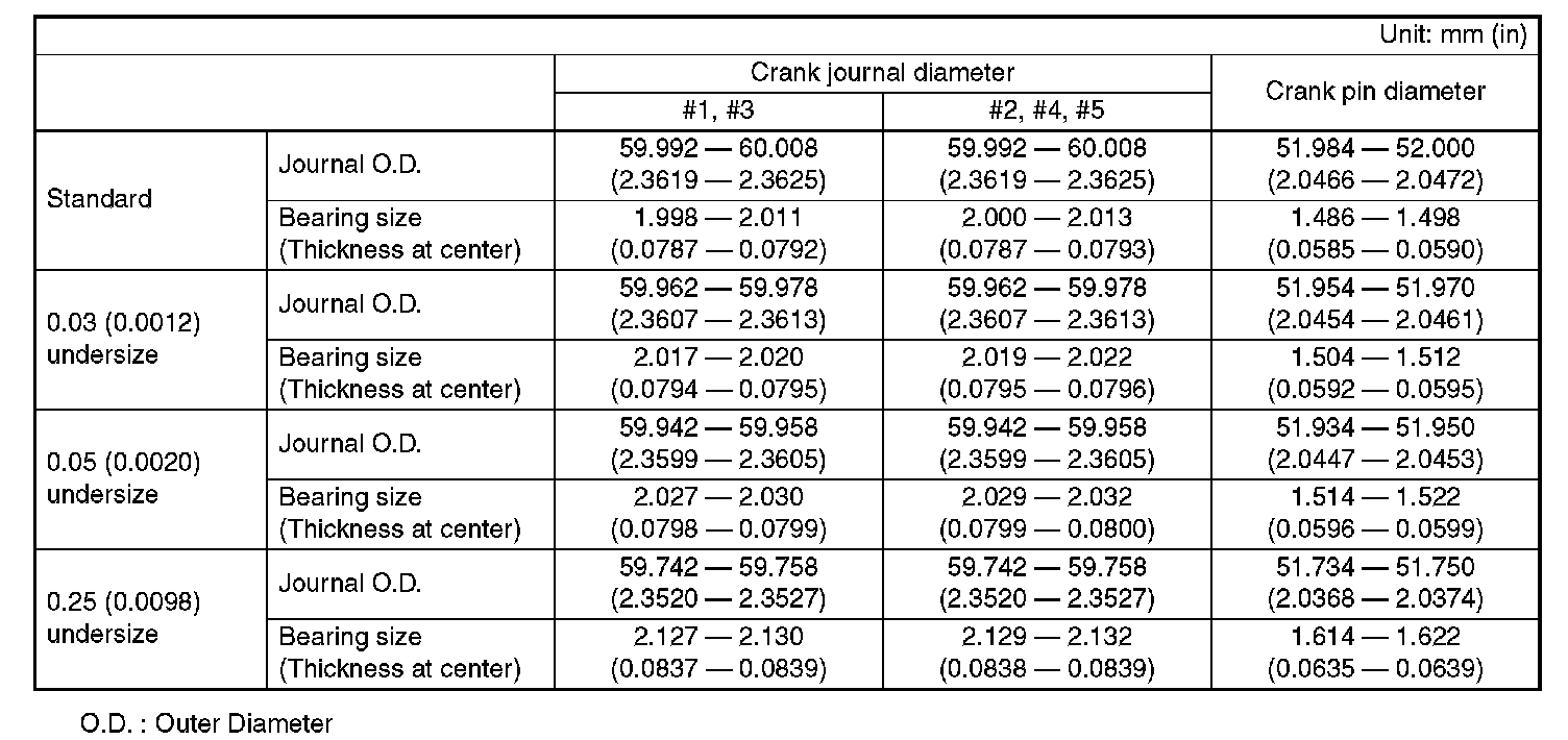 3. Inspect the crank journal and crank pin for wear. If they are not within the specifications, replace the bearing with a suitable (undersize) one, and replace or recondition crankshaft as necessary. When grinding the crank journal or crank pin, finish them to the specified dimensions according to the undersize bearing to be used.