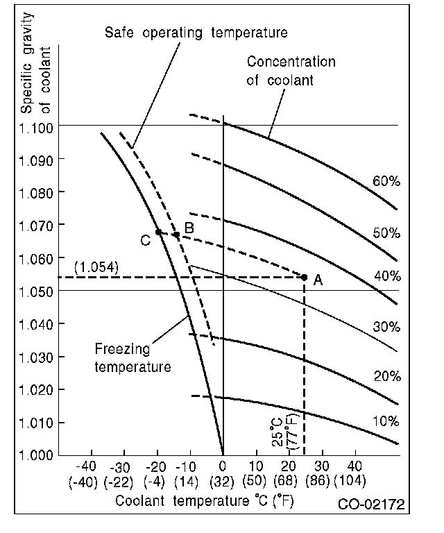 If the coolant temperature is 25°C (77°F) and its specific gravity is 1.054 and the concentration is 35% (point A), the safe operating temperature is -14°C (7°F) (point B), and the freezing temperature is -20°C (-4°F) (point C).
