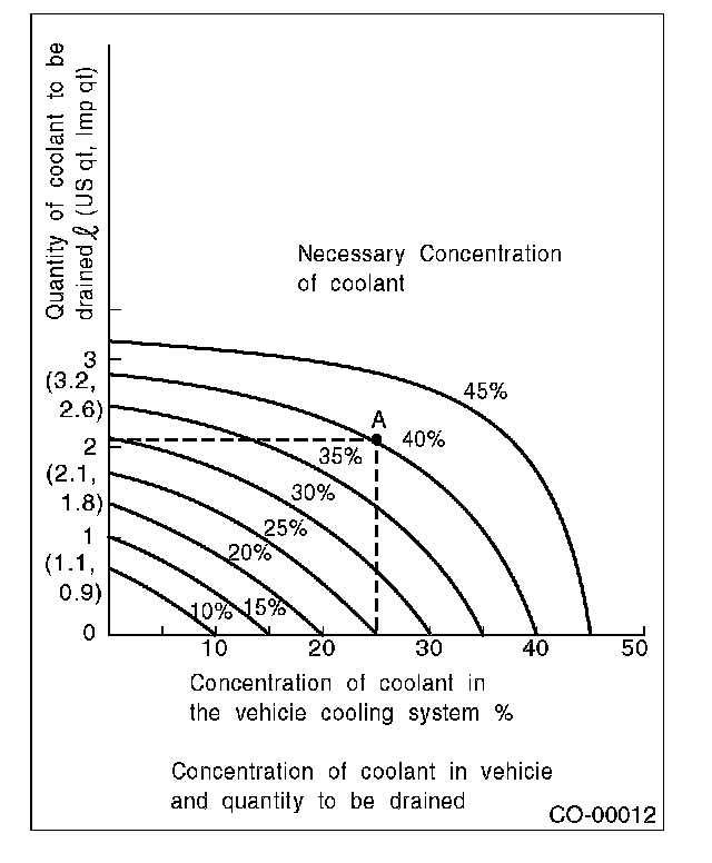 Assume that the coolant concentration must be increased from 25% to 40%. Find point A, where the 25% line of coolant concentration intersects with the 40% curve of the necessary coolant concentration, and read the scale on the vertical axis of the graph at height A. The quantity of coolant to be drained is 2.1 L (2.2 US qt., 1.8 Imp. qt.). Drain 2.1 L (2.2 US qt., 1.8 Imp. qt.) of coolant from the cooling system and add 2.1 L (2.2 US qt., 1.8 Imp. qt.) of the undiluted solution of SUBARU coolant.