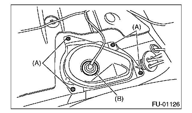 2. Push the grommet (B) down under the body and remove the service hole cover.