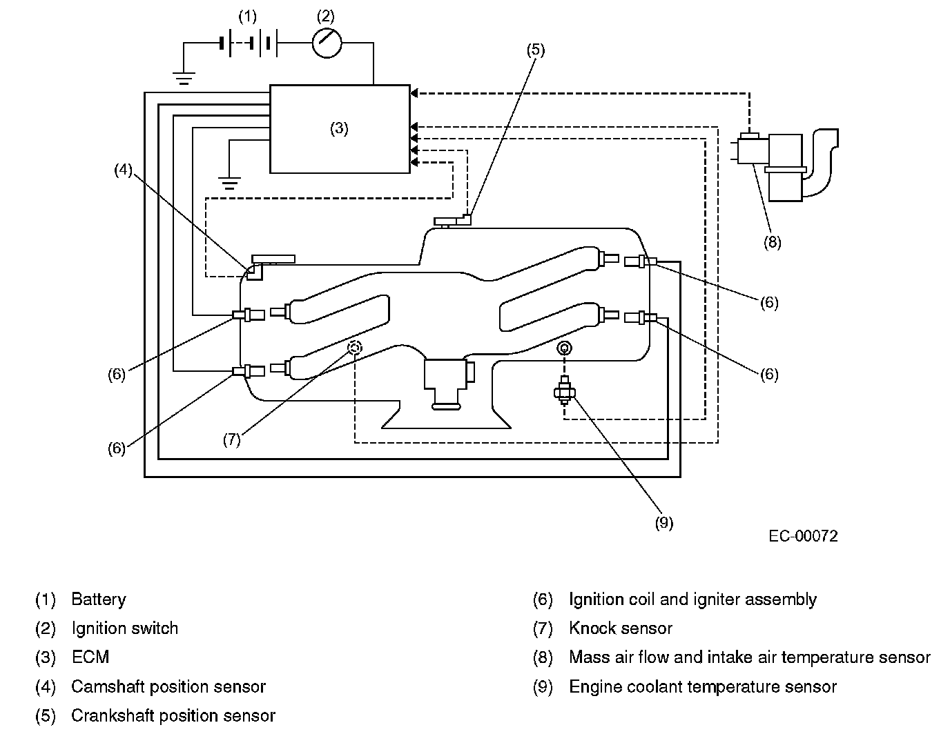 The ECM monitors the operating condition of the engine using the signals from the sensors and switches shown below and determines the ignition timing most appropriate for each engine operating condition. Then it sends a signal to the igniter, commanding generation of a spark at that timing.