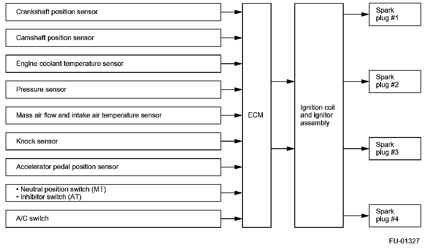 IGNITION CONTROL- The ECM determines operating condition of the engine based on signals from the manifold absolute pressure sensor, engine coolant temperature sensor, intake air temperature sensor, crankshaft position sensor and other sources. The ECM then selects the ignition timing most appropriate for the condition thus determined from those stored in its memory and outputs at that timing a primary current OFF signal to the igniter to initiate ignition.