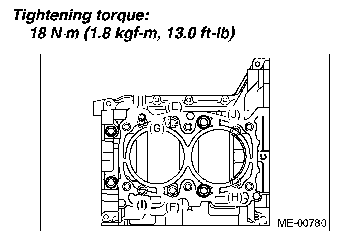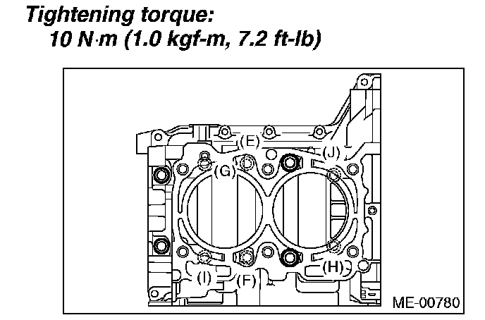 Tighten the 10 mm cylinder block connecting bolts on RH side (E-J) in alphabetical sequence.