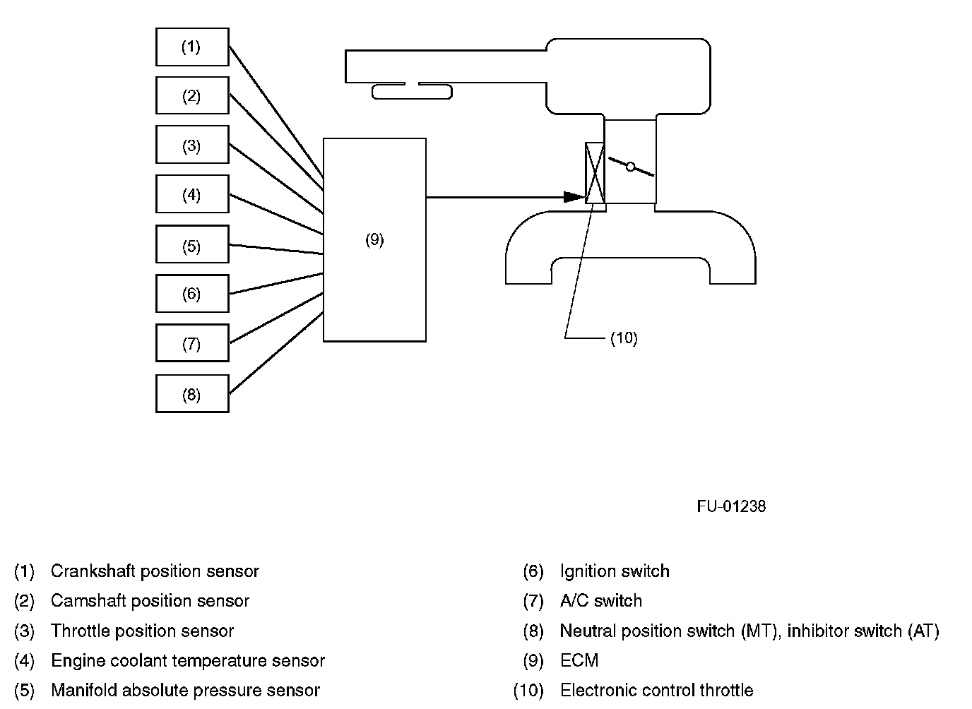 IDLE AIR CONTROL- The ECM controls the electronic control throttle based on signals from the crankshaft position sensor, engine coolant temperature sensor, manifold absolute pressure sensor and A/C switch so that the proper idle speed for each engine load is achieved.