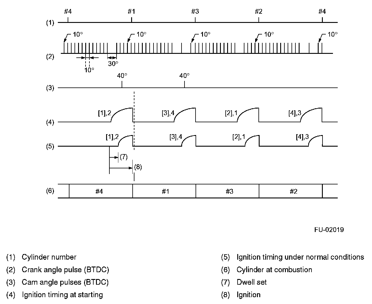 Engine speed fluctuates during start of the engine, so the ECM cannot control the ignition timing. During that period, the ignition timing is fixed at 10 degrees BTDC by using the 10 degrees signal from the crankshaft position sensor.