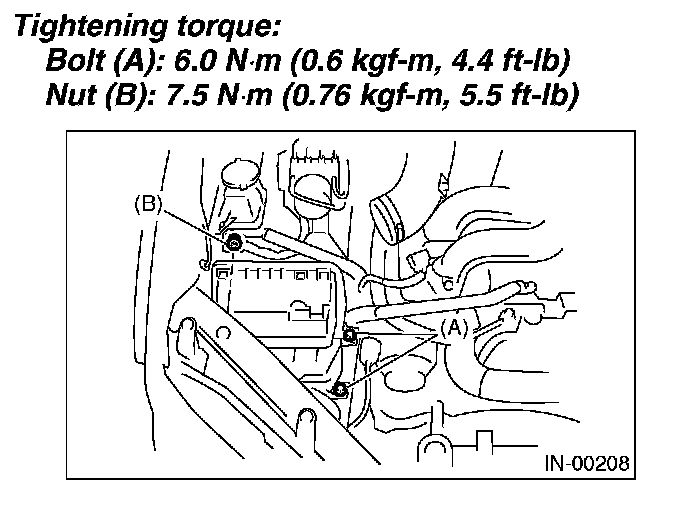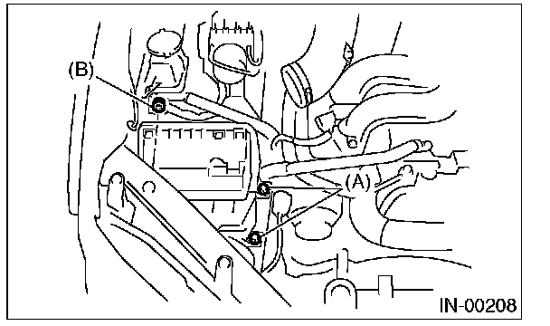 7. Remove the bolt (A) and nut (B) which hold the air cleaner case on body.