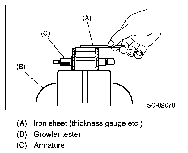 Check the armature for short-circuit by placing it on growler tester. Hold an iron sheet (thickness gauge, etc.) against the armature core while slowly rotating the armature. A short-circuited armature will cause the iron sheet to vibrate and to be attracted to core. If the iron sheet is attracted or vibrates, the armature, which is short-circuited, must be replaced or repaired.