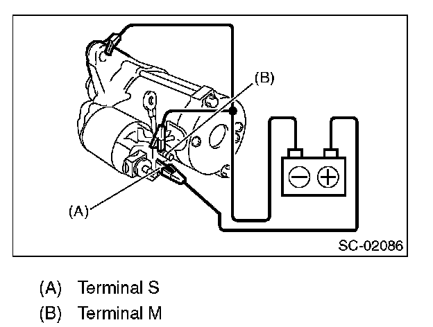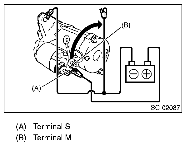 Connect the positive terminal to terminal S and the negative terminal to terminal M and starter body to pull the pinion gear at the main contact point. Make sure the pinion gear returns to its original position when the terminal S is disconnected.