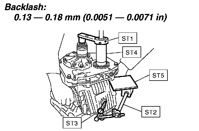9. Turn the drive pinion several times with ST1 and check to see if the backlash is within the specified value with ST2, ST3, ST4 and ST5.