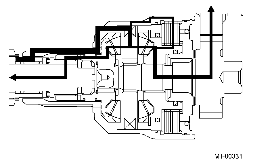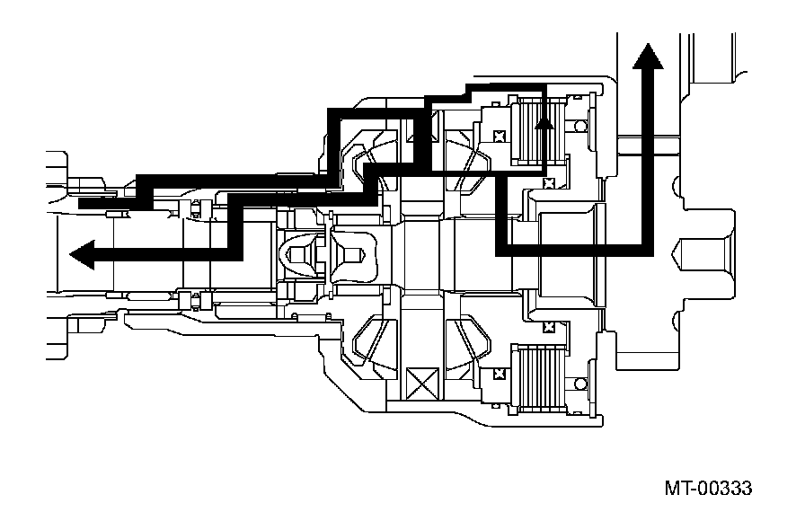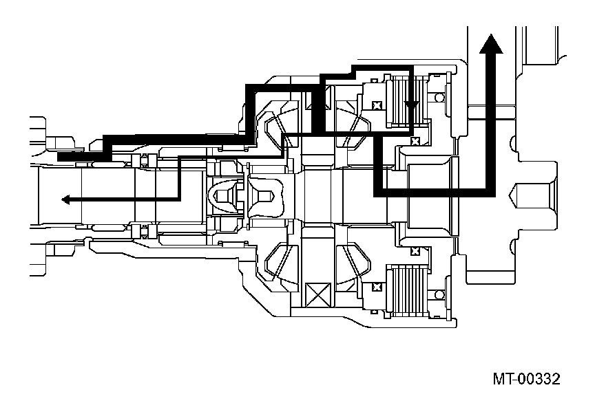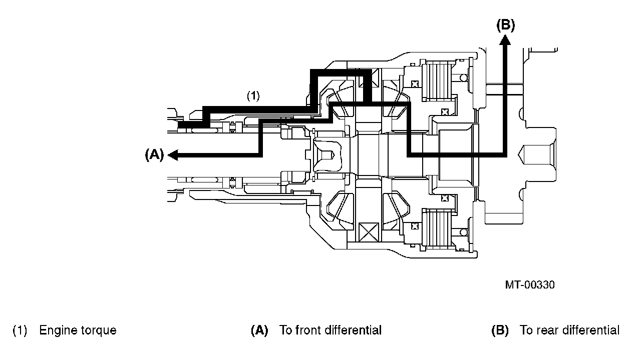 FUNCTIONWhen there is no speed difference between the front and rear wheels, the center differential delivers the engine torque to the front and rear wheels at a ratio of 50:50.
